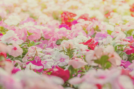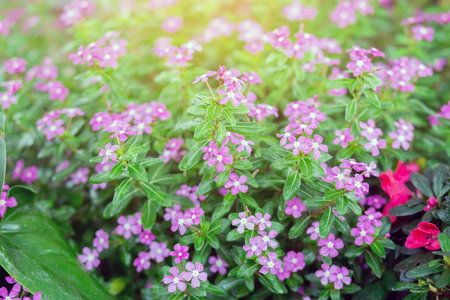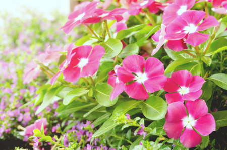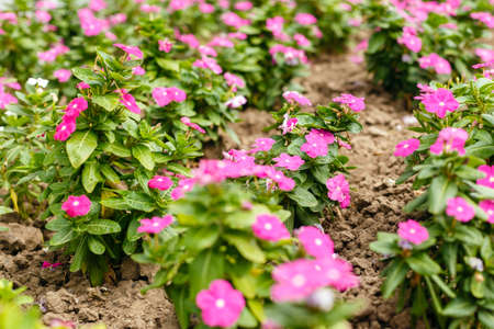 Vinca rosea flowers blossom in the garden, foliage variety of colors flowers, selective focus