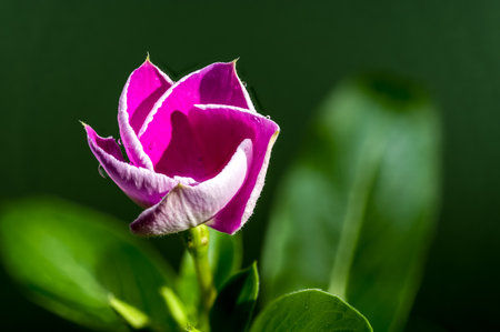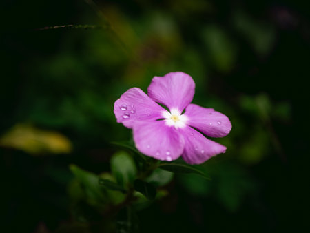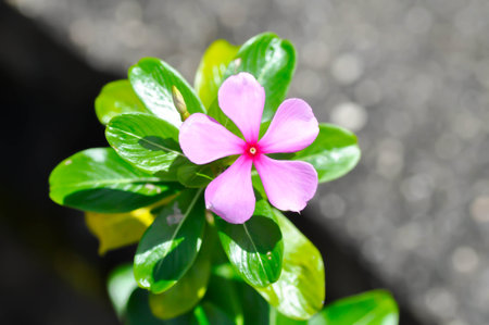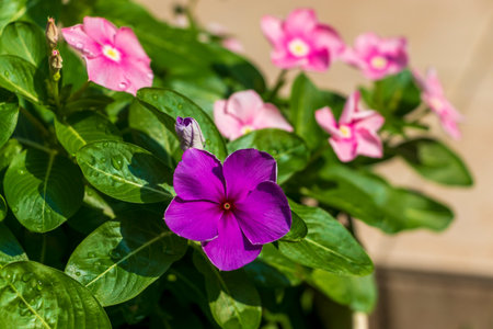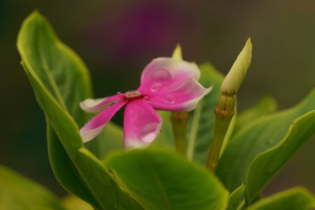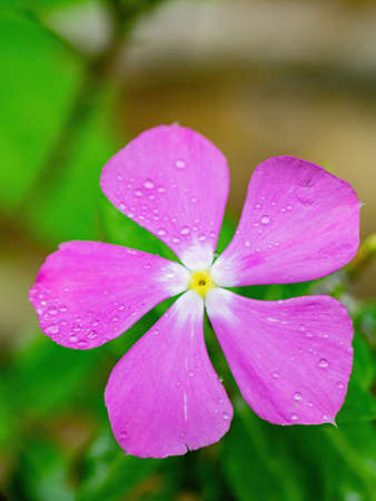 Pink Rose Periwinkle (Catharanthus roseus) with water pearls on petals, tropical flower known for its ornamental beauty and use in natural herbal remedies and traditional medicine