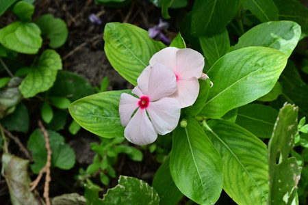 Catharanthus roseus, commonly known as bright eyes, Cape periwinkle, graveyard plant, Madagascar periwinkle, old maid