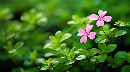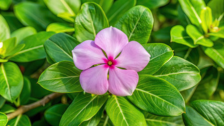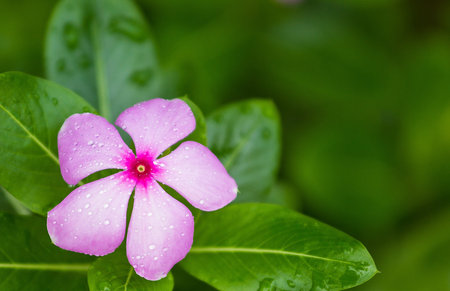 Beautiful pink Vinca flower (Catharanthus roseus) with raindrops and lush green foliage, symbolizing endurance and widely cultivated for decoration and traditional healing purposes