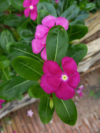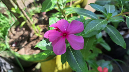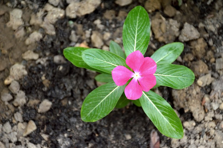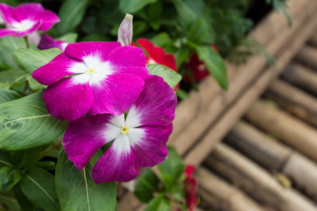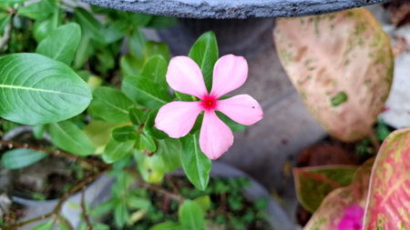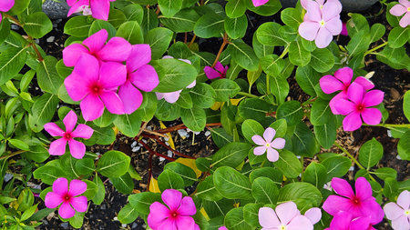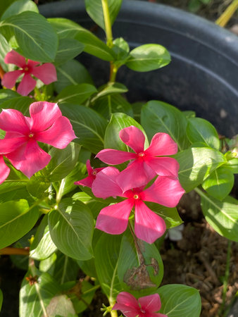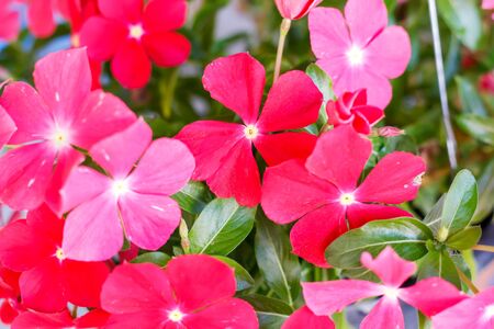 Top view of red and pink flower blooming and growing in flower pot. Natural plant and Decorative flower. Cape Periwinkle, Bright Eye, Indian Periwinkle, Madagascar Periwinkle or Pink Periwinkle.
