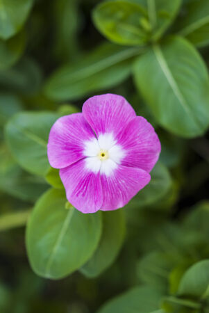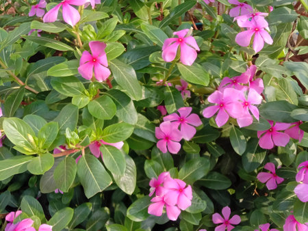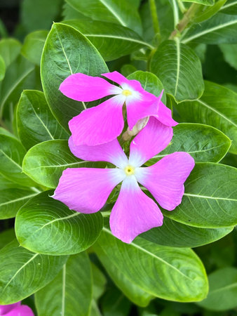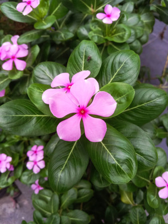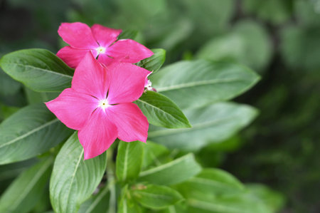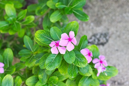 Pink flowers of periwinkle plant and green leaves (Ari Atoll, Maldives)
