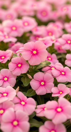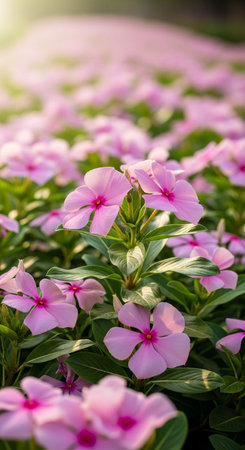 Close-up view of delicate pink vinca flowers with dark green leaves, showcasing their intricate petals and vibrant color.