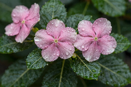 Pink periwinkle flowers with raindrops on green leaves, close up