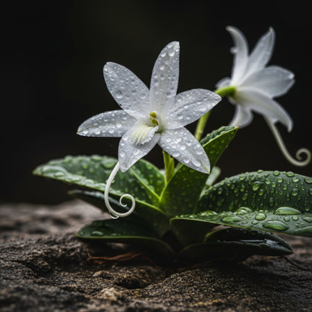 Beautiful white flower with water drops on dark background, stock photo
