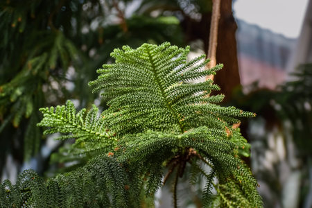 Detailed view of the intricate, layered foliage of a Norfolk Island pine tree, showcasing its vibrant green color and delicate texture against a blurred backdrop