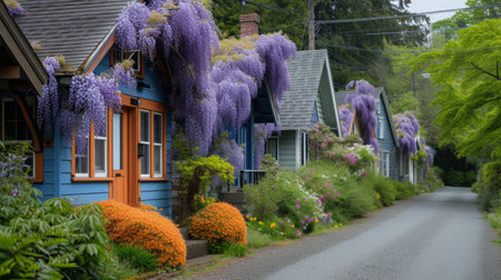 A row of quaint cottages adorned with cascading wisteria blooms.