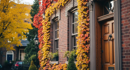 Autumn leaves on the facade of a house in Boston, Massachusetts.