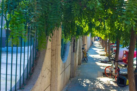 Narrow sidewalk along the fence and green trees. Green tunnel, parked cars and bicycles. In the distance, blur the background