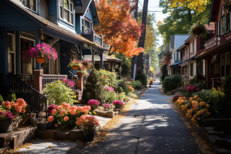 A picturesque street showcasing charming houses adorned with vibrant flower boxes and lush greenery, creating a tranquil and inviting atmosphere.