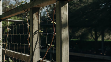 Sunlit garden trellis with climbing vines enhancing natures serene beauty.