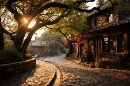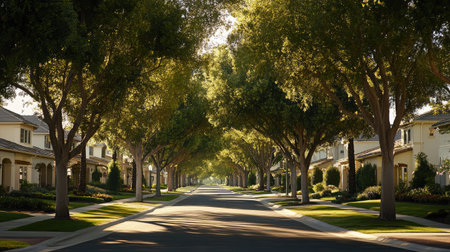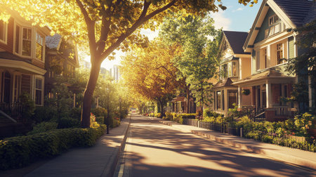 A residential street is lined with houses and lush trees, creating a serene ambiance. The scene is illuminated by sunlight, highlighting the architectural details and the greenery. This image can be used for commercial and editorial purposes, suitable for illustrating real estate, community living, and environmental themes.