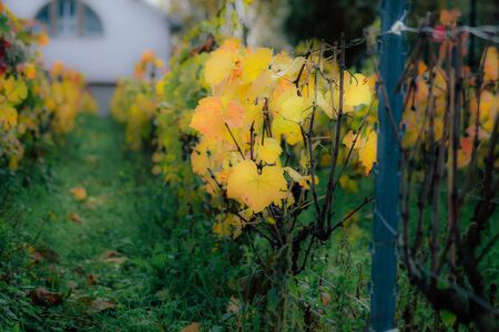 Vibrant autumn tones illuminate a vineyard pathway, flanked by yellow and orange foliage. the scene showcases a serene forest ambiance, with gently curving trees framing the lush vineyard corridor. Generative AI