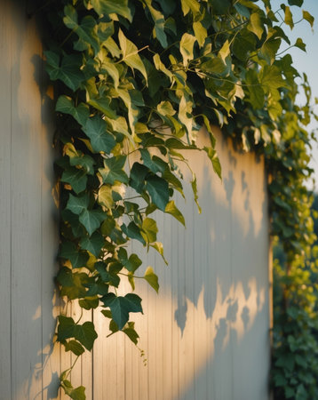 AI Generated. Wooden wall adorned with green ivy leaves in soft evening light creates a serene atmosphere