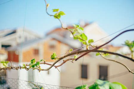 Blossoming buds on the kiwi vine. The leaves of the kiwi tree bloom in the spring.