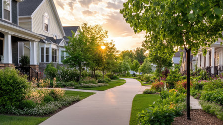 A serene suburban neighborhood captures the essence of tranquility with lush greenery, vibrant flowers, and a picturesque pathway at sunset.