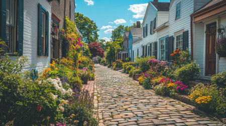 A charming cobblestone street lined with vibrant flowers and colorful bunting creates a picturesque setting for leisurely strolls and outdoor gatherings.