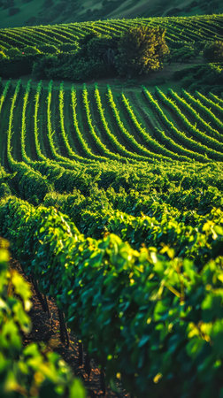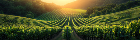 Rows of lush grapevines extend down a picturesque hillside, illuminated by the warm glow of the golden hour. This tranquil vineyard setting invites appreciation of nature's beauty.