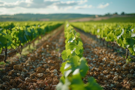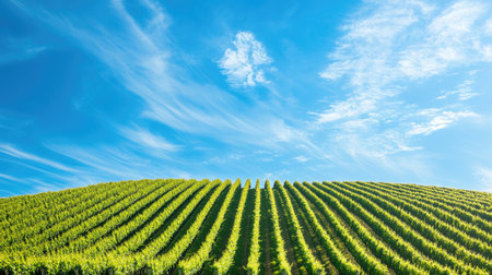 A vibrant vineyard stretches across a hilly landscape under a bright blue sky, showcasing lush green rows of grapevines, symbolizing growth and tranquility.