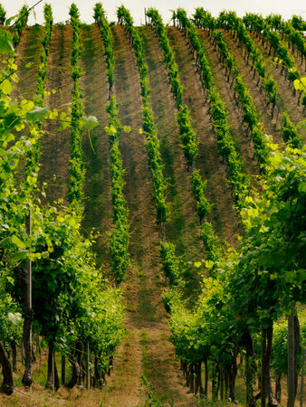 Portrait style image of rows in a vineyard, focusing on the vertical alignment and textures. AI generated.