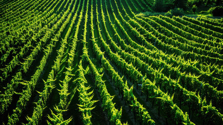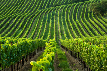 Vibrant Green Vineyard Rows Undulating Gently Under the Golden Sunlight During Early Evening Hours.