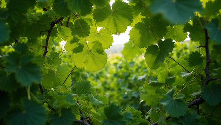 Lush grapevine leaves with intricate texture and deep green color