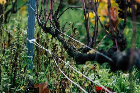Beautiful autumn vineyard landscape with vibrant yellow and red leaves, showcasing misty morning atmosphere and frost-covered ground. Harvest and nature concept.