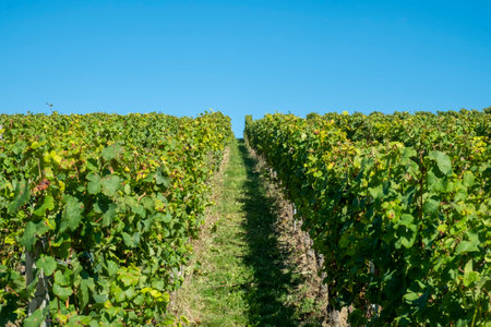 Summer on vineyards of Cognac white wine region, Charente, white ugni blanc grape uses for Cognac strong spirits distillation and wine making, France, Grand Champagne region