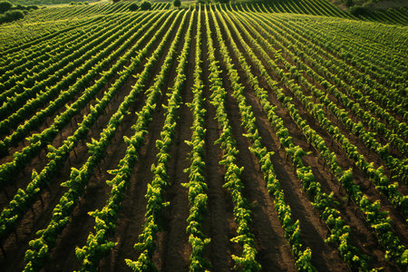 Panoramic view of a vineyard with a clear focus on the rows stretching towards the horizon. AI generated.