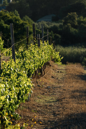 Ripe grapes growing in neat rows across a vineyard, soaking up the warm, golden light of the hour just before sunset