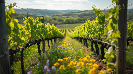 vineyard landscape interspersed with blooming wildflowers in spring