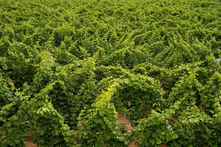 Panorama view of Green field with rows of vines. Ripe grapes for the production of fine wines.