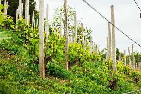 Plantation of grapes bearing vines in spring. Grapevine. Wine growing in the field. Agriculture. Young grapes with leaves. Fruit. Vineyard in early summer time