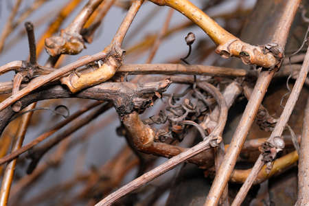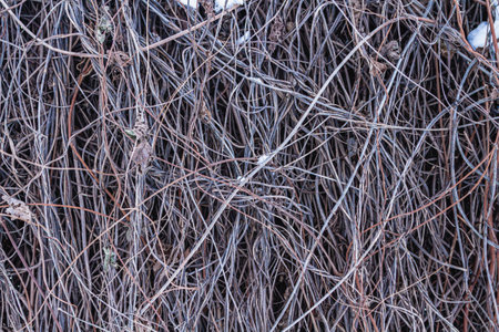 Old grape vines dried on a metal grid closeup. Abstract background.