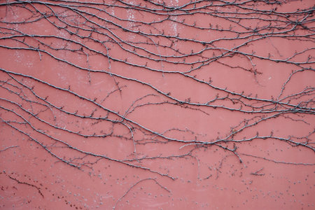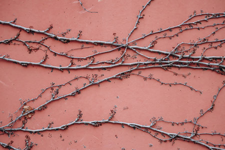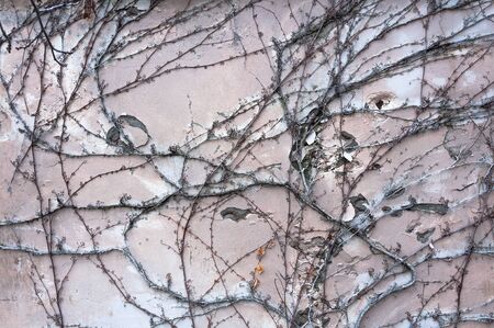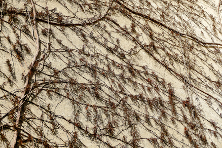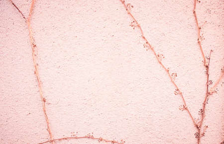 Pink dry branches of ivy on the wall. Red ivy leaves on a concrete wall.
