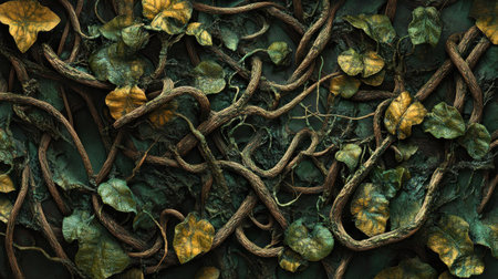 A complex arrangement of twisted vines creates an intricate pattern among bold green foliage and hints of golden leaves, showing nature's artistry in a vibrant landscape.