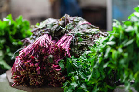 Top view of a traditional Thai vegetable market display with bundles of fresh green leafy vegetables and herbs