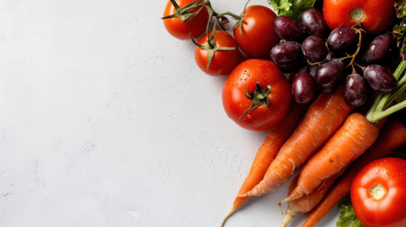 A vibrant assortment of fresh vegetables arranged neatly on a white surface, perfect for promoting healthy eating habits and culinary creativity.