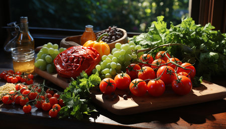 A variety of natural foods, including fruits and vegetables, are displayed on a table. These plantbased ingredients can be used in recipes to create delicious dishes AIG50