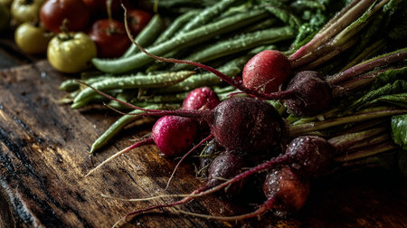 Freshly Harvested Vegetables: Radishes, Green Beans, and Tomatoes on Rustic Wood