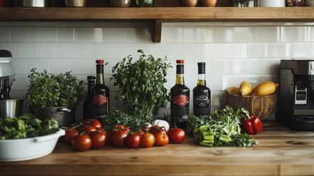 Bright veggies and herbs neatly arranged with plenty of room for branding or text