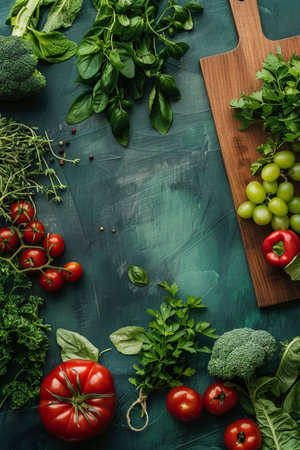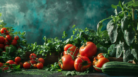 Fresh tomatoes and a variety of green herbs arranged on a teal backdrop, creating a vibrant and organic display. Ideal for themes of nutrition, freshness, and healthy eating.