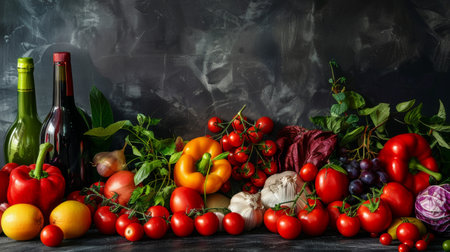 A vibrant assortment of fresh organic vegetables and fruits displayed artfully on a dark background, perfect for any culinary or nutrition-focused project.