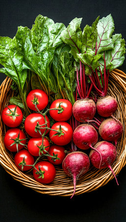 A vibrant collection of farm-fresh produce arranged in a rustic basket, capturing the natural beauty and color of garden-harvested ingredients.