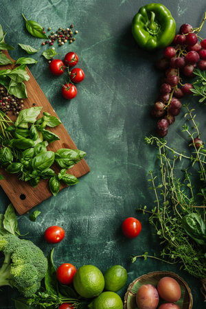 Healthy food background with various vegetables, aromatic herbs and spices ingredients. Generative Ai.