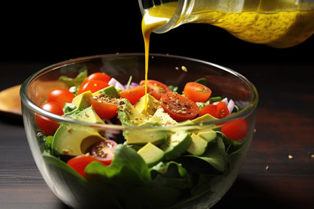 pouring dressing over an avocado salad in a glass bowl, created with generative ai
