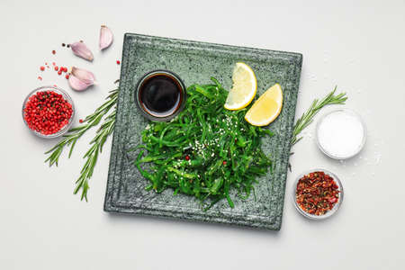 Laminaria salad (Kelp) with red ginger and sesame seeds. Seafood rich in iodine and minerals. Healthy eating concept. Cooking food stone background, top view, copy space