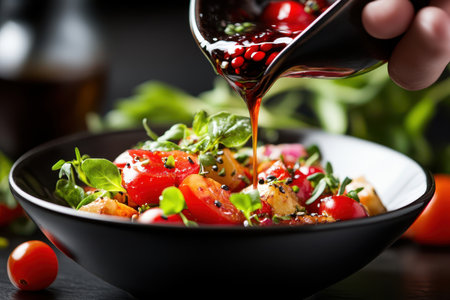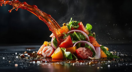 A vibrant, artfully arranged salad with fresh vegetables and a rich sauce being poured over it, set against a dark background.