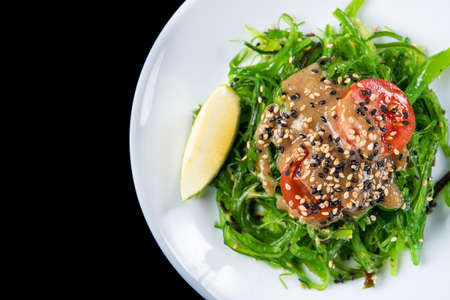 Chuka salad with tomato and lime isolated on a black background