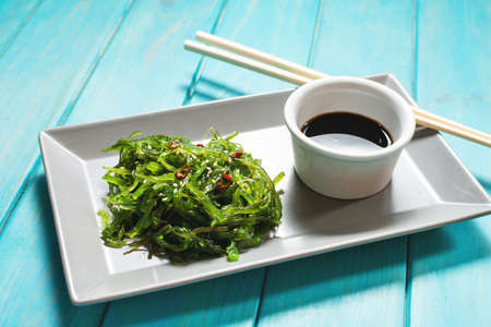 Wakame seaweed salad with sesame seeds and chili pepper in a bowl on a blue wooden background